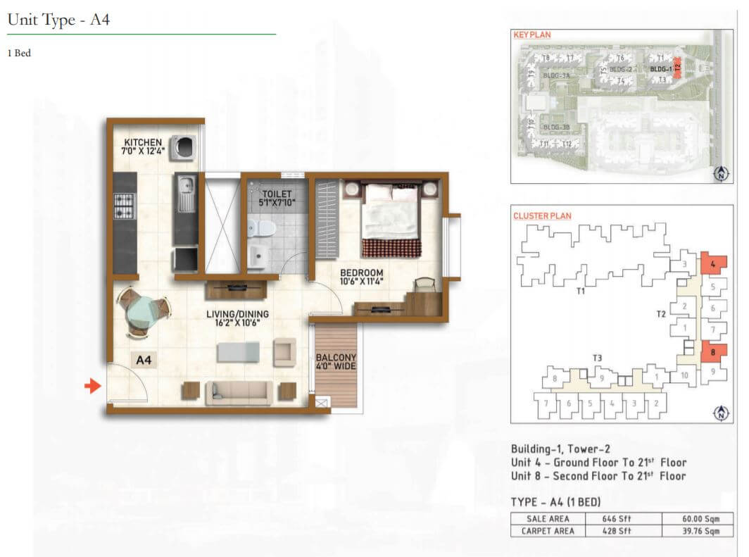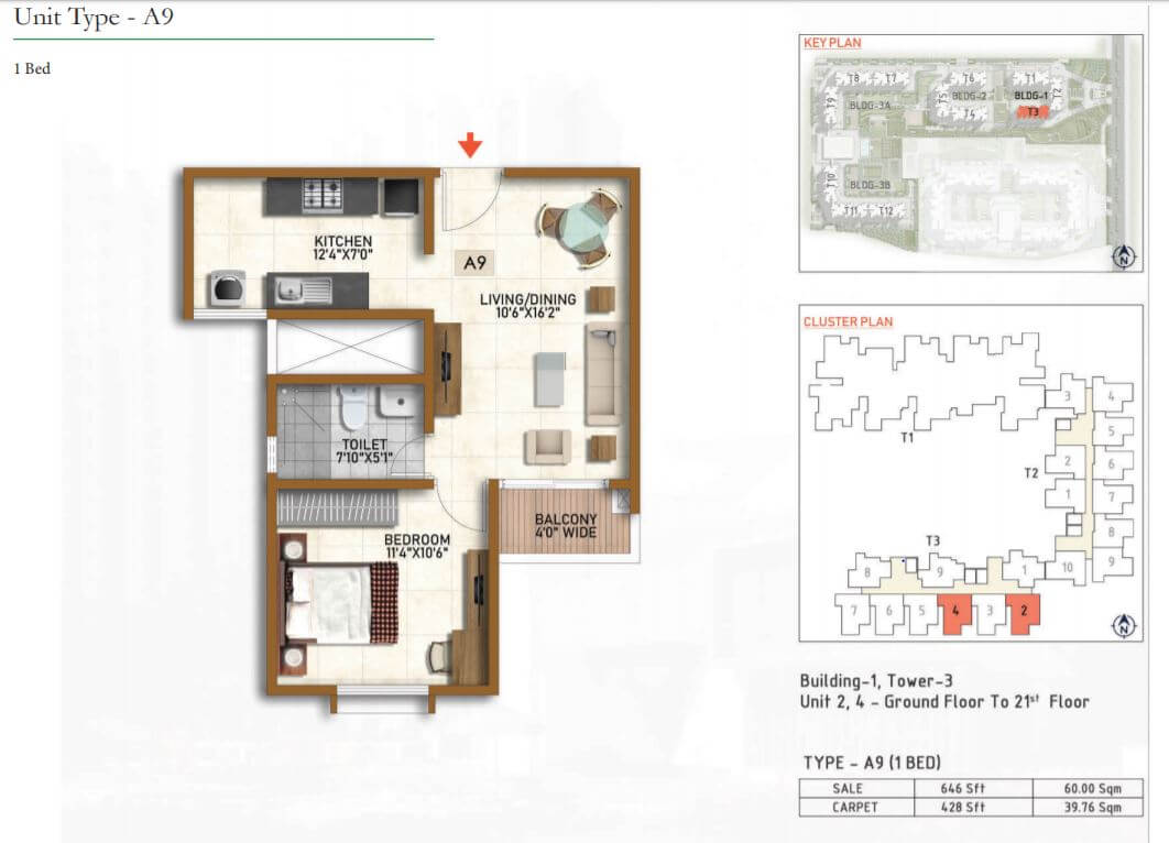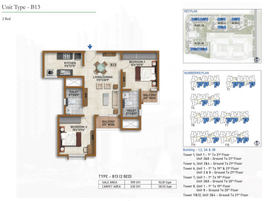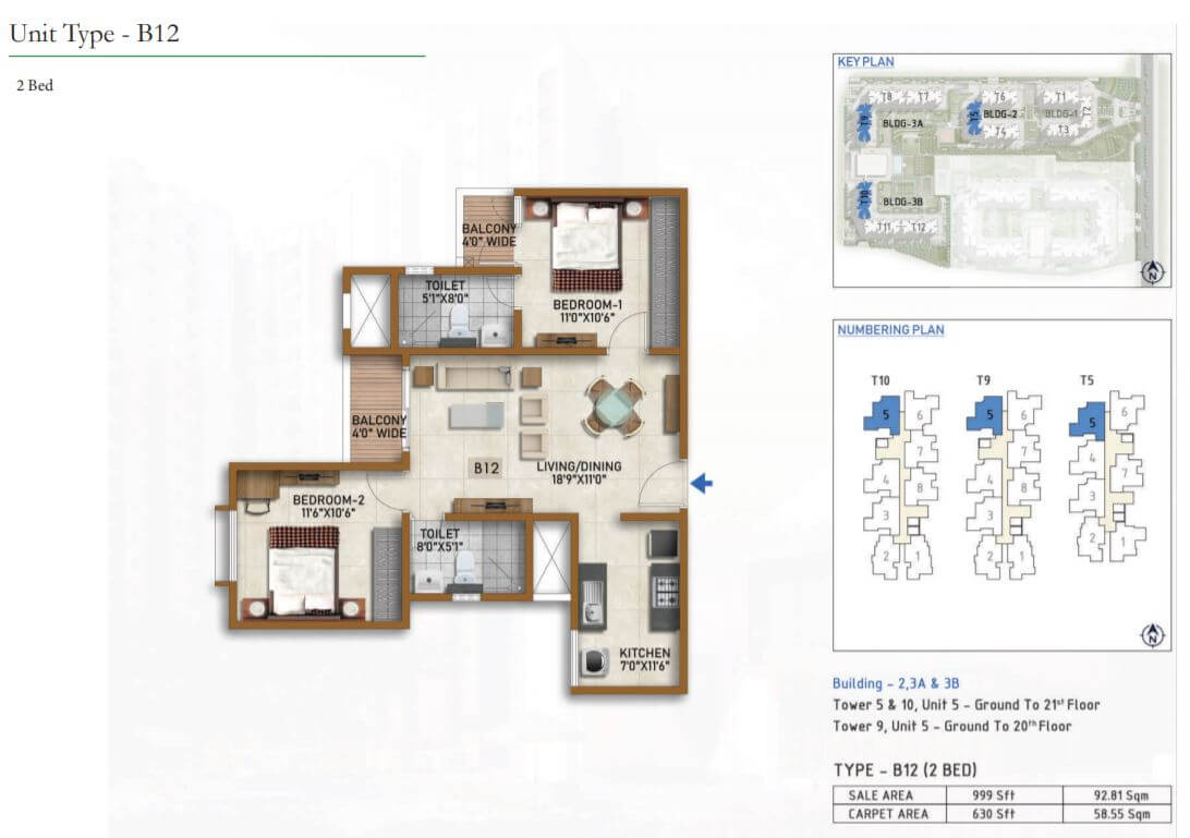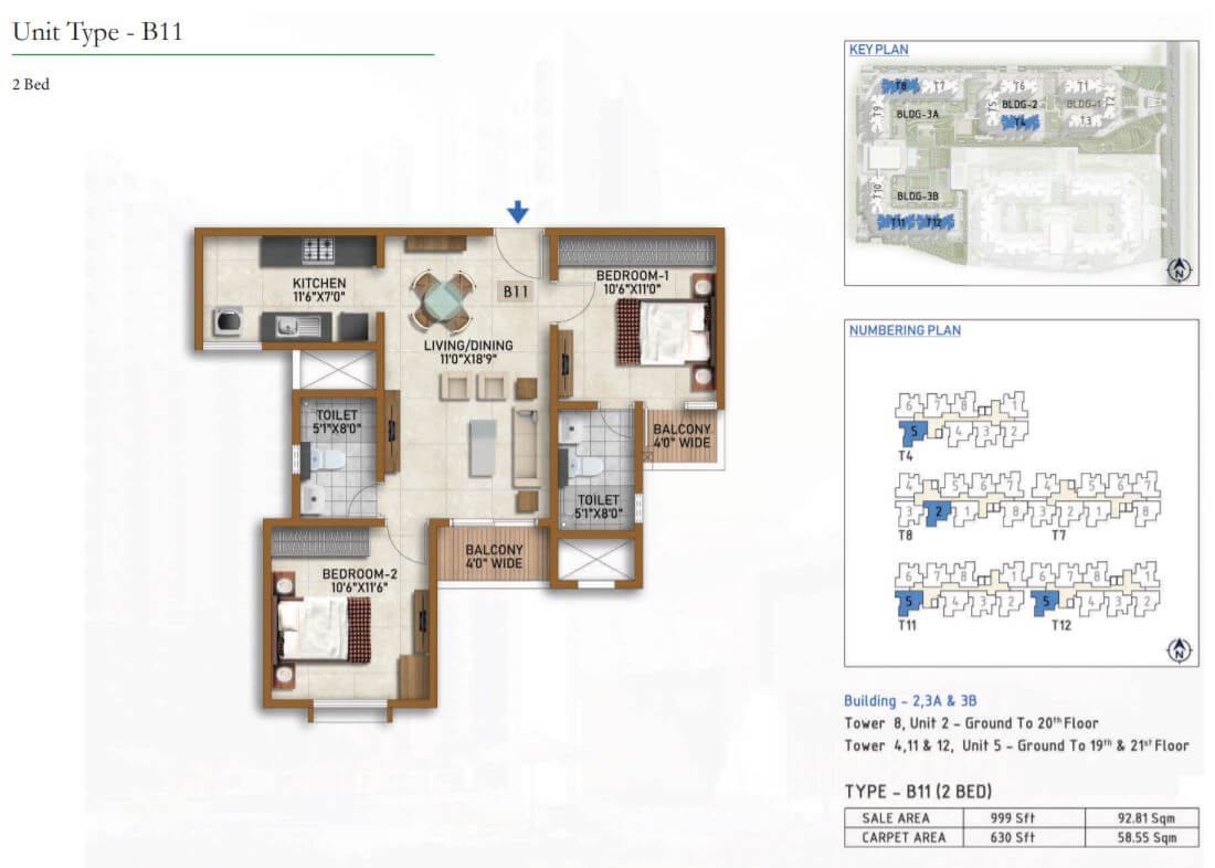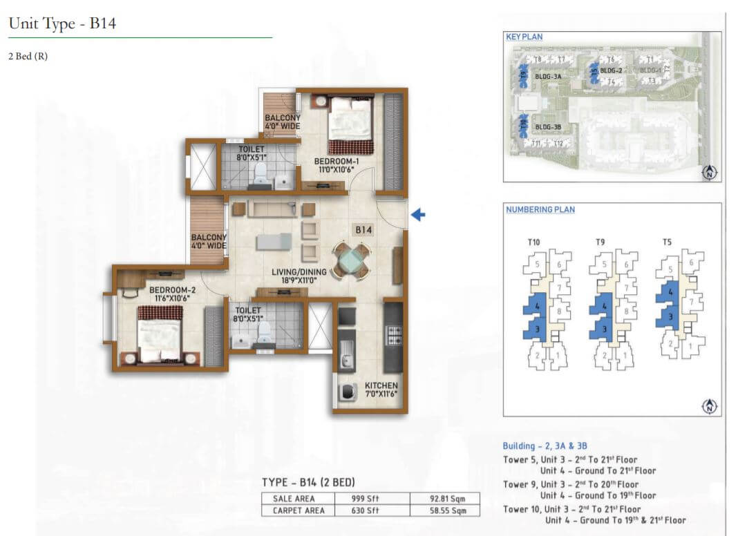 | 2 BR | 999 Sqft | 630 Sqft | 60L Onwards* |